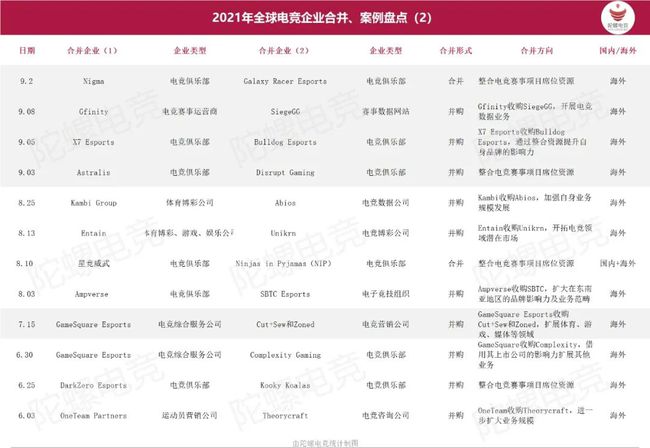 据陀螺电竞不完全统计,2021年全球电竞产业合并、并购案共有39起