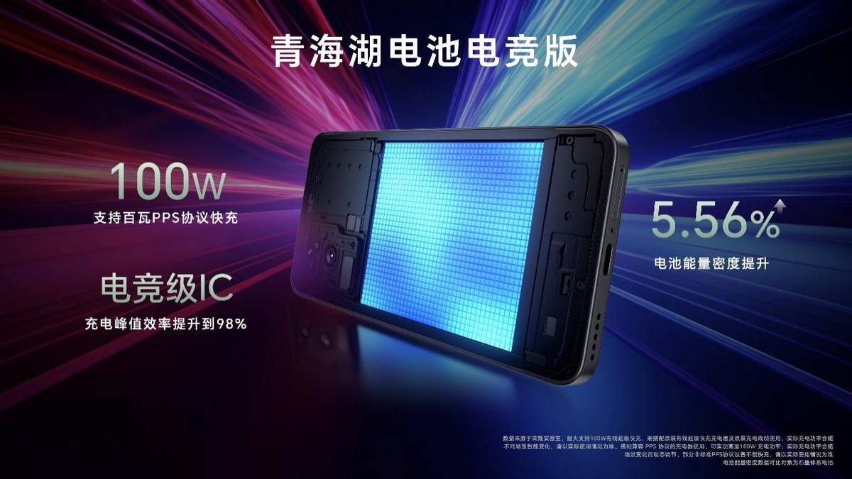 荣耀GT搭载青海湖电池电竞版,具备高能量密度和低放电损耗的优势,电池能量密度提升5.56%,支持100W超级快充,内置电竞级IC,充电峰值效率高达98%,能够在短时间内快速恢复战斗力。