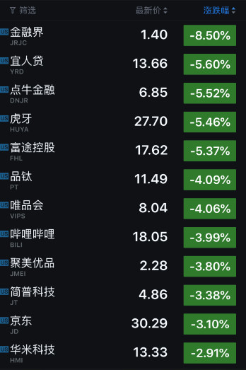 另一方面,跌幅较大的公司包括:金融界(跌8.50%)、宜人贷(跌5.60%)、点牛金融(跌5.52%)、虎牙(跌5.46%)、富途控股(跌5.37%)、品钛(跌4.09%)、唯品会(跌4.06%)、哔哩哔哩(跌3.99%)、聚美优品(跌3.80%)、简普科技(跌3.38%)、京东(跌3.10%)。