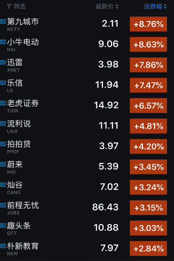 中国概念股涨跌各半,其中涨幅较大的公司包括:第九城市(涨8.76%)、小牛电动(涨8.63%)、迅雷(涨7.86%)、乐信(涨7.47%)、老虎证券(涨6.57%)、流利说(涨4.81%)、拍拍贷(涨4.20%)、蔚来汽车(涨3.45%)、灿谷(涨3.24%)、前程无忧(涨3.15%)、趣头条(涨3.04%)。
