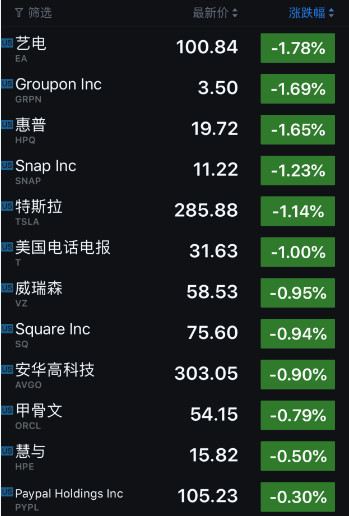 另一方面,跌幅较大的公司包括:艺电(跌1.78%)、Groupon(跌1.69%)、惠普(跌1.65%)、Snap(跌1.23%)、特斯拉(跌1.14%)、AT&T(跌1.00%)。