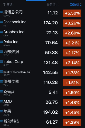 美国科技股多数上涨,其中涨幅较大的公司包括:Sonos(涨5.50%)、Facebook(涨3.26%)、Dropbox(涨2.60%)、Roku(涨2.21%)、西部数据(涨2.17%)、iRobot(涨2.14%)、Spotify(涨1.78%)、德州仪器(涨1.51%)、Zynga(涨1.50%)、AMD(涨1.48%)、苹果(涨1.45%)。