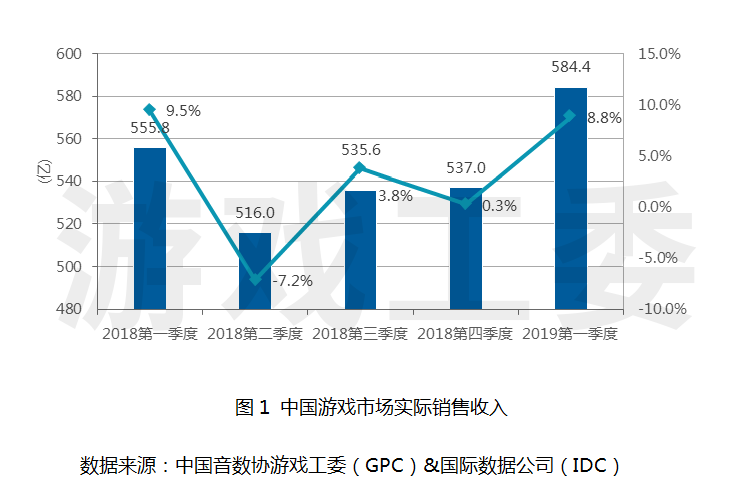 昨日,中国音数协游戏工委发布由《中国游戏产业报告》编撰工作组撰写的2019年第一季度中国游戏产业报告。报告显示,2019年一季度,中国游戏市场整体呈现回升的态势,实际销售收入达到584.4亿元,相比2018年第四季度增长47.4亿元,同比增长5.1%,环比增长8.8%。市场结构趋于稳定,用户规模继续扩大,已突破6.4亿人,同比增长6.7%,仍有一定上升空间。中国自主研发游戏继续保持收入领先地位,占领超七成市场。
