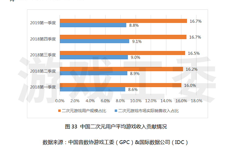2018第一季度至2019第一季度期间,中国二次元游戏用户规模占比16.7%,贡献了8.8%的整体游戏收入,二次元游戏用户的平均游戏产品消费能力仍有较大的提升空间。