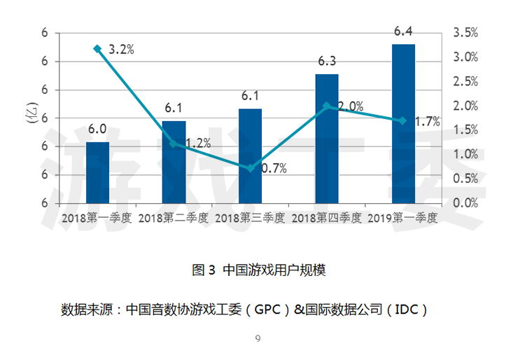 2019年第一季度,中国移动游戏市场实际销售收入为377.5亿元,环比增长8.5%,同比增长10.3%。尽管2018年第二季度中国移动游戏市场实际销售收入骤减,但总体仍呈增长趋势。移动游戏市场实际销售收入同比份额继续增加,占比为64.6%,相比于2018年年均增长率62.5%略有上升,与2018年第四季度的64.8%基本保持一致,移动游戏用户规模为6.2亿人,环比增长2.1%。