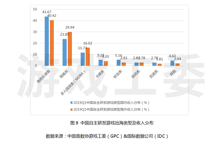 值得注意的是,2019年第一季度中国自主研发游戏海外总收入为30亿美元,占据企业收入的30.9%,成为中国游戏企业重要的收入来源。出海游戏中,三类游戏较受欢迎,分别为角色扮演类、策略类和多人竞技类(MOBA)游戏;这三类游戏的收入合计占据海外总收入的86.3%。