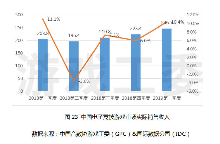 2019年第一季度,中国电子竞技游戏市场实际销售收入246.7亿元, 相比于2018年第四季度实际销售收入增长23.3亿元,环比增长10.4%,同比增长21.1%。中国电子竞技用户规模为4.4亿人,环比增长1.8%,同比增长12.8%。