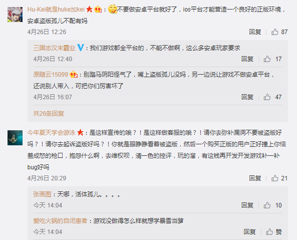 评论区的玩家也只持有三种态度:1、盗版司马,推荐不做安卓版;2、支持正版,推荐全程联网反盗版;3、键盘侠:客服态度恶劣,不做好反盗版怪玩家咯?