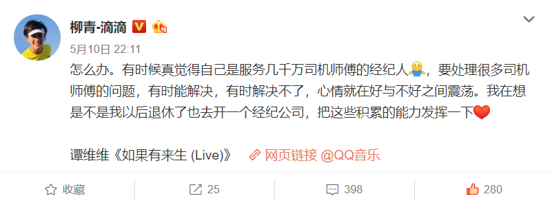 速途网5月11日消息(报道:李楠)昨日晚间,滴滴出行总裁柳青在微博中袒露心声,并附上歌曲《如果有来生》。在工作中,柳青觉得自己是服务几千万司机师傅的经纪人,要处理很多司机的问题,有时能解决,有时解决不了,这让她的心情在好与不好之间震荡。
