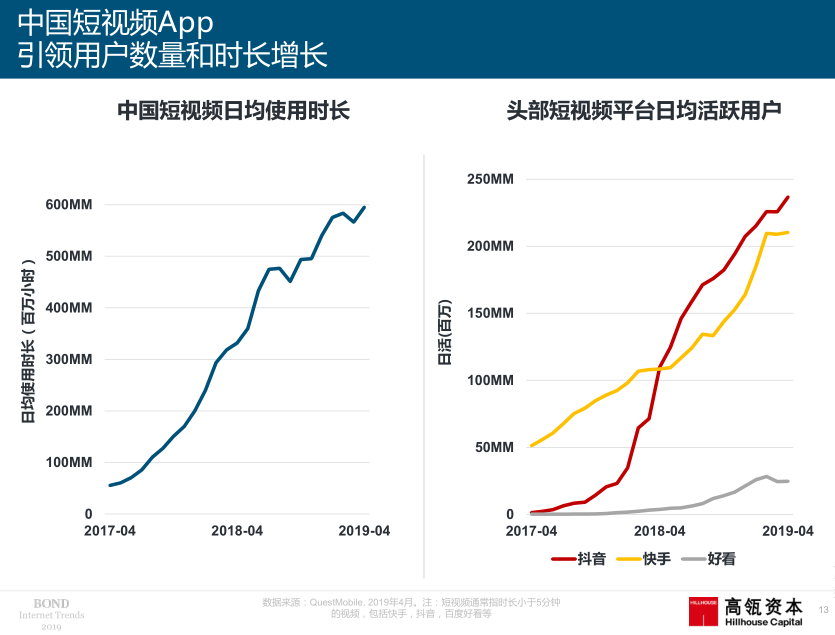 去年发布的《2018互联网趋势报告》中,已提到中国短视频的领导者快手日活跃用户超过1亿,这是一个快速增长且高互动(用户每日平均使用时长50分钟)的新领域。
