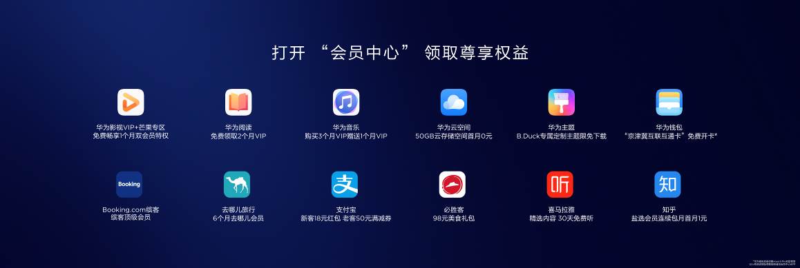 除以上专享福利外,华为终端云服务为nova 5系列用户准备的尊享权益礼包还包括以下内容:免费畅享一个月华为影视VIP+芒果专区双会员特权、华为云空间50GB云存储空间首月0元、B.Duck小黄鸭专属定制主题限时免费下载;Booking缤客顶级会员、去哪儿旅行半年会员、支付宝新客18元红包及老客50元满减券、必胜客98元美食礼包、喜马拉雅精选内容30天免费听、知乎盐选会员连续包月首月1元等;nova 5 Pro用户还可在Huawei Pay免费开通“京津冀互联互通卡”。