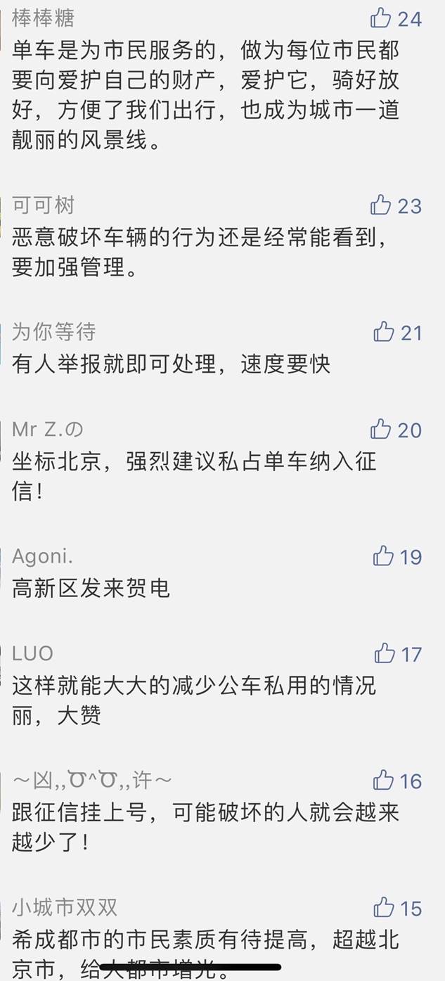 不少网友留言表示支持滴滴共享单车平台严厉打击此类损人利己的违法行为。