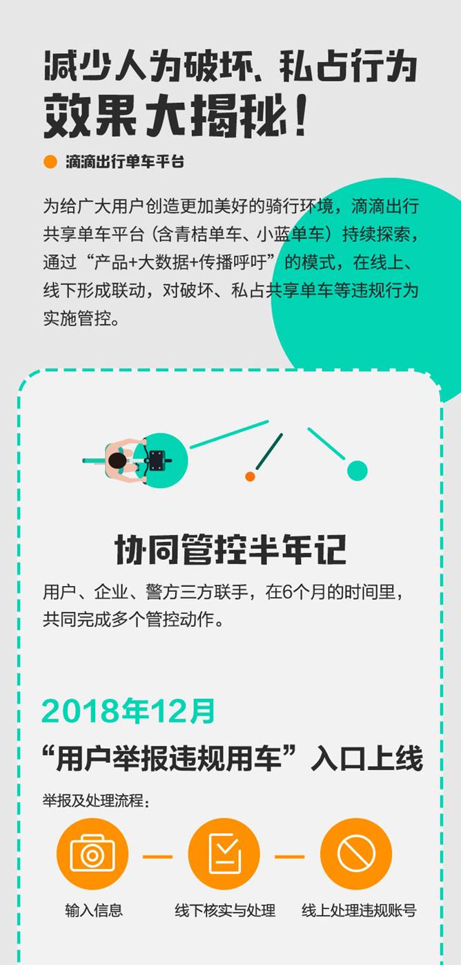 2018年12月,滴滴共享单车平台“用户举报违规用车”入口上线,2019年1月,私占行为判断的大数据评估策略上线,2019年3月《滴滴出行单车平台用户惩罚规则》出台。对于涉嫌破坏、私占共享单车的用户,滴滴共享单车平台会首先通过短信、push推送、客服回访等方式进行多次提醒,期间用户可随时与滴滴单车平台客服沟通、反馈真实情况。
