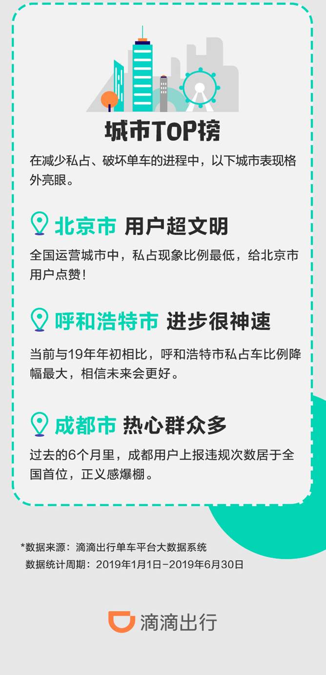 据了解,这次半年管控还产生了城市TOP榜。其中,北京“用户超文明”在全国运营城市中私占现象比例最低;呼和浩特“进步最神速”,与年初相比,呼和浩特市私占车比例降幅最大;成都“热心群众多”,过去的6个月里,成都用户上报违规次数居于全国首位。