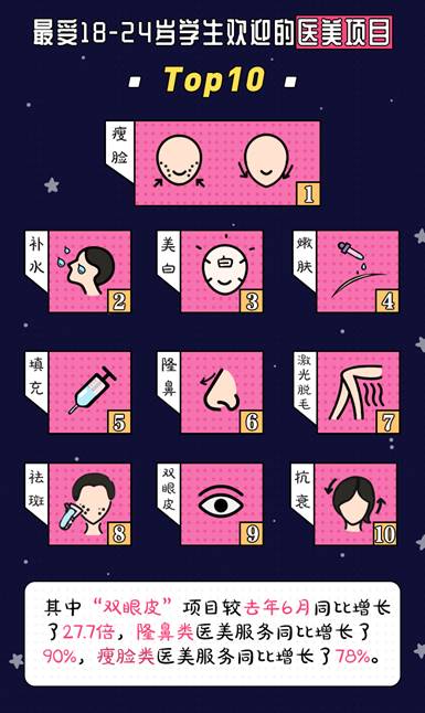 跟工作一族相比,学生族选择的整形消费更轻巧,偏重于“轻医美”类型,从天猫和阿里健康联合推出的《2019暑期医美数据》看,最受学生们欢迎的项目中,排在前三的包括了瘦脸、补水、美白。不过,随着人们对于医美的开放度日益提高,填充、隆鼻、祛斑和开双眼皮也越来越受到关注,其中,开双眼皮的人数同比增长翻了整整27倍。