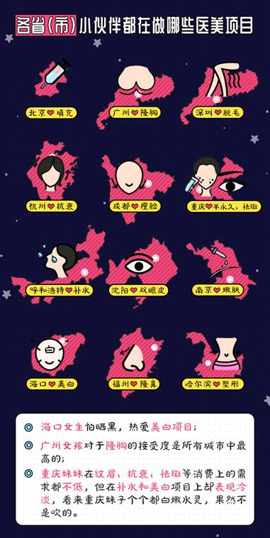 沈阳人爱开双眼皮、福州人爱隆鼻、重庆爱半永久…不同城市人们对整形项目的青睐,大致可以看出文化和地域引发的审美差异。例如,炎热的海口时时都有被晒伤的危机,人们对美白类医美的追求在各个城市中占比最高;而广州对于隆胸的接受度是所有城市中最高的;有意思的是,重庆人在半永久、抗衰、祛斑等消费上的需求都不低,但在补水和美白项目上却表现冷淡,看来重庆妹子个个都白嫩水灵,果然不是吹的。