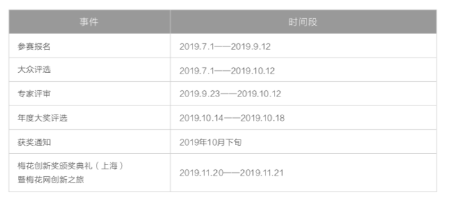 即日起至9月12日,为第七届梅花创新奖公开征集参选作品阶段,2018年9月2日-2019年9月1日期间的作品均可报名。有意参加评选的机构或个人可以通过梅花创新奖官网报名。