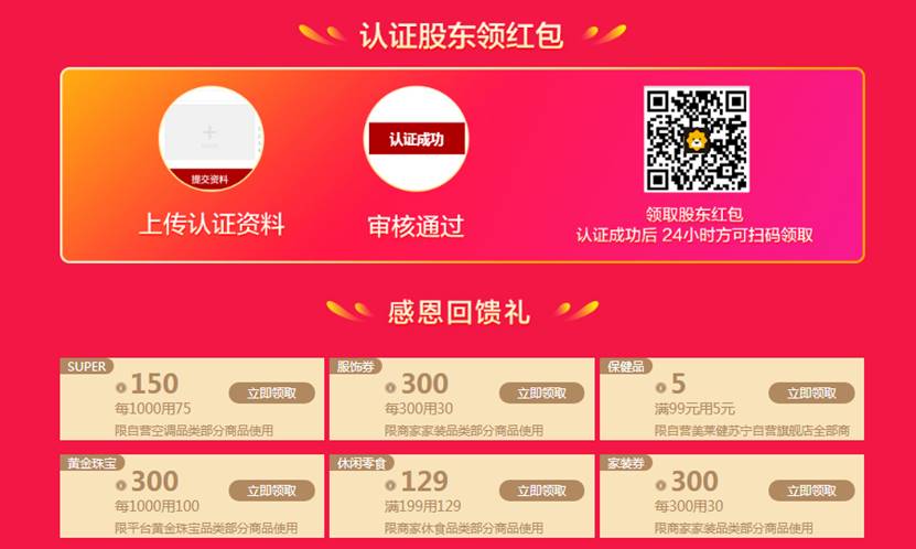 据苏宁易购相关负责人介绍,今年股东回馈活动的时间为7月20日至7月21日。活动期间,苏宁易购将上线“股东感恩全家桶”,包含黄金珠宝、服饰、保健品、休闲食品、家装等各品类满减券。