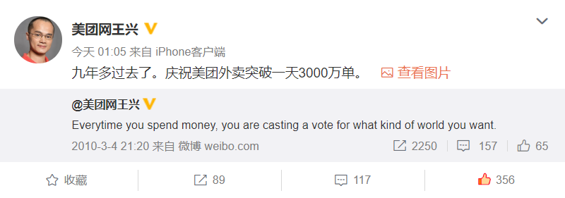 而在九年前,王兴发博表示:Everytimeyou spend money,you are casting a vote for what kind of world you want。