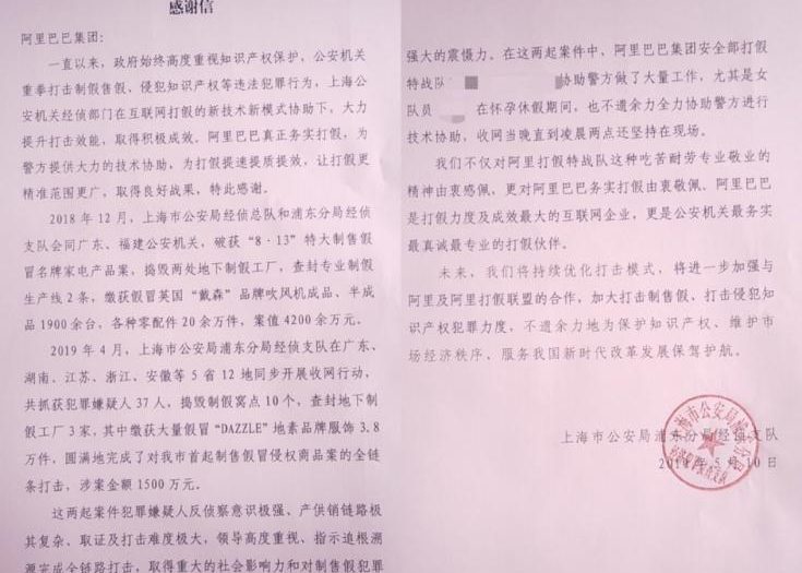 今年5月10日,上海市公安局浦东分局经侦支队向阿里巴巴集团发出感谢信,称阿里巴巴是打假力度及成效最大的互联网企业,更是公安机关最务实最真诚最专业的打假伙伴,为警方提供大力的技术协助,为打假提速提质提效,让打假更精准范围更广。