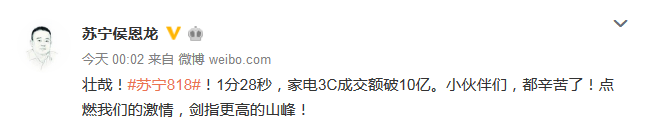 速途网8月18日消息(报道:李楠)今天凌晨,苏宁易购发布818发烧购物节实时战报。第一小时内,全渠道订单量暴涨251%。仅用时1分28秒,家电3C整体成交额突破10亿。