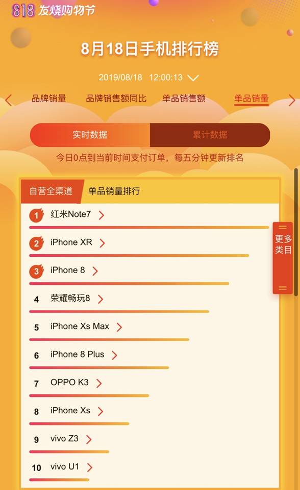 苏宁818期间,苹果、华为等多款手机降价,“以旧换新”加持,消费者的购买热情被激发。截至8月18日12点,红米Note7夺单品销量第一,iPhone XR、iPhone 8紧追其后。小米、荣耀系列产品表现抢眼,品牌销量额进入前三。