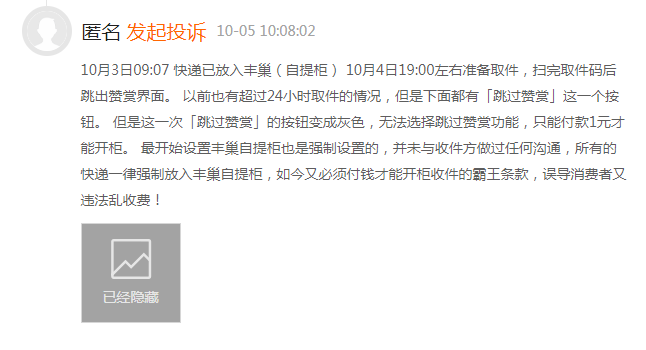 然而一年时间过去,指责“丰巢强制收费”的问题依然存在。在微博之上,速途网输入丰巢收费的字样,便可以看见不少用户的吐槽。黑猫投诉之上,也有着类似的问题。更有用户提及,自己曾遭遇丰巢“跳过赞赏”按钮变成灰色,无法选择,只能付款开柜。
