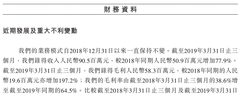 2016年,赤子城推出了人工智能引擎Solo Aware,带来营收及利润的大幅增长。2016到2018年,赤子城营收年复合增长率达42.2%。2018年,赤子城毛利1.41亿元,同比增长101.0%;净利为5974万元,同比增长86.8%。今年一季度,赤子城加速增长,总体收入同比增长77.9%,毛利同比增长197.2%,毛利率高达64.5%。