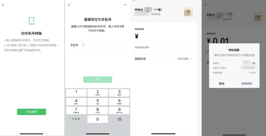 转账过程中,也会有页面提示一定要开启相关功能开关。随着手机号输入,则会出现对方的微信昵称以及真实姓名的最后一个字,以确保转账对象的正确性。输入转账金额以后,也会有相应的提示。
