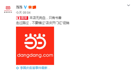 当李国庆与俞渝公然开撕后,当当官方微博的动态也备受关注。早上九点,当当官方微博称:本店无狗血,只有书香,走过路过,不要错过“店庆开门红”促销 !