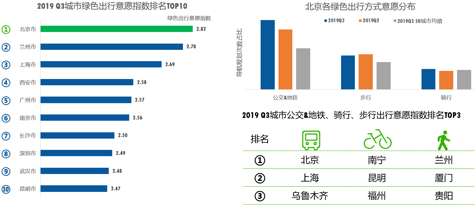 随着城市公交与地铁、共享单车等公共交通基础设施的完善,绿色出行已蔚然成风。《报告》发布了2019年第三季度城市绿色出行意愿指数榜,北京高居榜首。