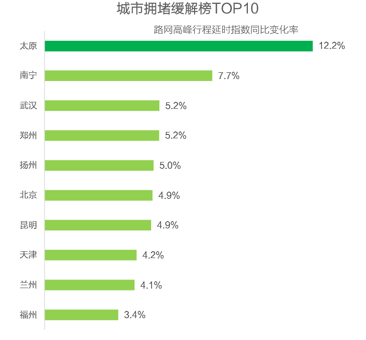 从本季城市拥堵缓解榜来看,太原路网高峰行程延时指数同比下降最大,达12.2%,其次是南宁和武汉。拥堵缓解的10个城市中有9个为直辖市或省会城市。