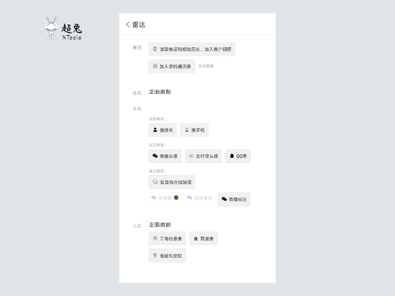知己知彼,百战不殆。一个电话号码可以挖掘出很多客户信息,这些信息有利于销售后期跟进。【超兔快目标】app的雷达功能,通过手机号,查微信、QQ、支付宝;通过企业名称,查工商信息,查地址,百度查:查官网和新闻报道; 还有自动微信头像、自动支付宝头像,快速实现客户公开信息进CRM系统,为销售跟进做好全方位背景调查。