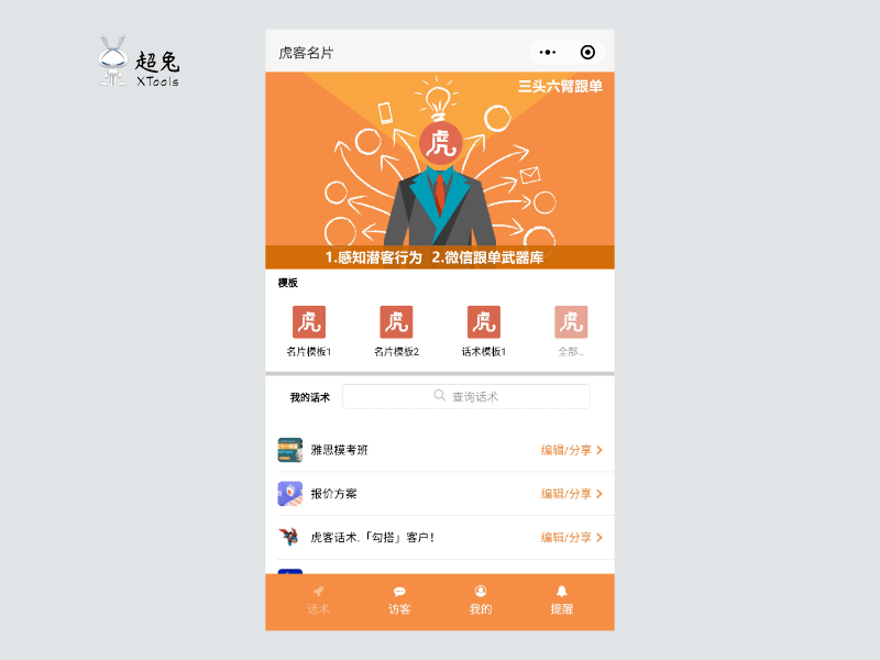4)【虎客名片】自动感知潜客意向:虎客名片不仅仅是电子名片,还是销售的产品推荐模板,通过自带Hook(钩子)来帮助销售感知潜客行为。
