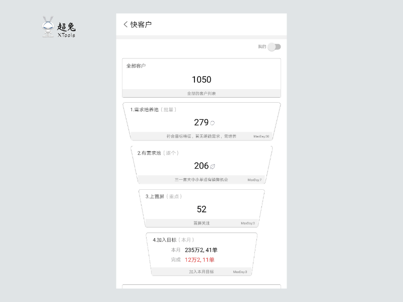 【超兔快目标】自动客池漏斗,在对全部客户做需求培养的过程中,一旦有销售机会或者「三一客」打标,就会自动进入有需求客池;在有需求客池里,销售做出业务跟进,判断为重点客户,则上首屏重点跟进;当销售做业务预估记录时,则该客户自动进入到本期目标。