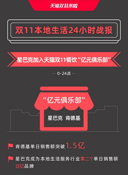 阿里本地生活平台数据显示,肯德基在双11当天8个多小时后进入“亿元俱乐部”,最终以超1.5亿成交额成本地生活最受欢迎品牌;星巴克紧随其后,在21:23进入“亿元俱乐部”。