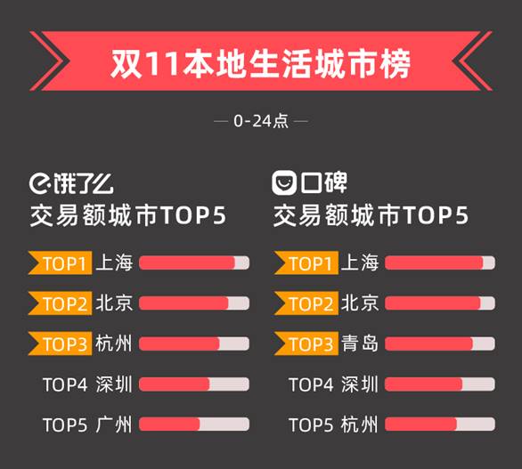 数据显示,饿了么交易额城市top5榜单,被“上北杭深广”五城用户包揽了;口碑交易额top5城市为上海、北京、青岛、深圳和杭州。杭州消费者买走超19000对鸡翅获封双11“炸鸡之城”,上海用户消费超20000单洗浴套餐成“桑拿之城”;小城青年正在成为本地生活行业“深度用户”,数据显示,黑龙江五常市用户双11商超零食订单同比增长260%,浙江省德清县水果订单同比增长173%。