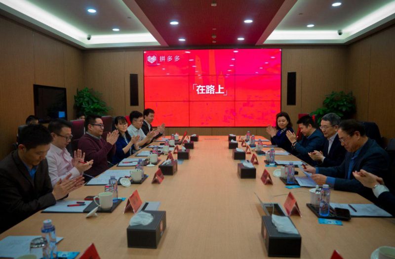 ▲中宣部版权管理局局长于慈珂,中国出版协会常务副理事长兼秘书长刘建国,上海市委宣传部副部长、上海市新闻出版局(上海市版权局)局长徐炯,上海市出版协会秘书长马加一行正在听取拼多多方面关于平台版权保护情况的汇报。(吴坤 摄)