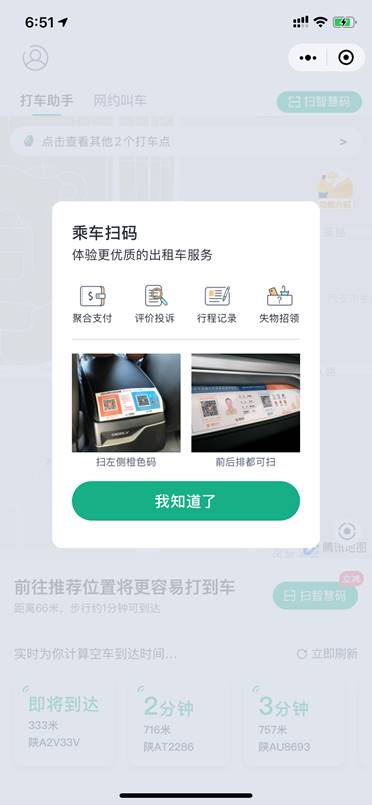 乘客通过打车助手乘车后,也可扫车上的「出租车智慧码」享受网约化出行体验。