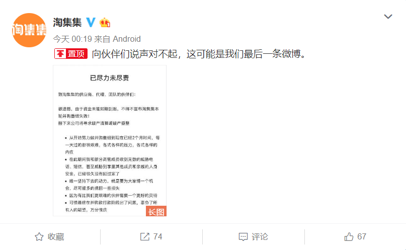 速途网讯 今天凌晨,淘集集创始人张正平发布公告宣布,淘集集本轮并购重组失败,接下来公司将寻求破产清算或破产重整。此外,张正平还在公告中表示,本轮共有两个投资人,投资人A是某大型集团公司,投资人B是某preIPO公司为牵头的基金公司。在公司账面无钱可用的情况下,已无法维持基本运营,且对投资人B是否会打款非常怀疑,所以被迫宣布并购重组失败。