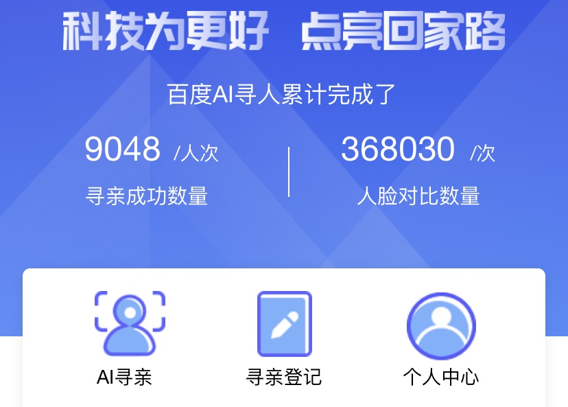 在“百度 AI 寻人”平台,用户发起照片比对接近40万次,9000多个走失者与家庭重新团聚;