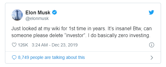 速途网讯 近日,马斯克发布Twitter称,自己的维基百科页不真实,他写道:“数年来第一次看了一眼我的维基百科页面。太不真实了。还有,谁可以帮我删掉‘投资者’这一项吗?我基本上没做过任何投资。”他还提到自己的两家公司——特斯拉和SpaceX——破产后会发生什么。他说,要是这两家公司破产的话,理论上,他也就破产了。