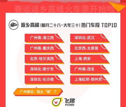 广州南站春运高峰客流量最高,成为最繁忙的火车站,占据了TOP10中的三个车段:广州南-湛江西,广州南-重庆西,广州南-茂名。