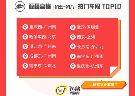 另外,根据飞猪平台火车票预约情况,春运回程高峰将出现在大年初五至初八,选择初六返程的人最多。春运回程高峰期间,热门车段TOP10的到达站同样被北、上、广、深四城“包场”,其中广州南站独占4席。看来,漂在北上广深的人最晚回家,经短暂的团圆后,又最早离家。