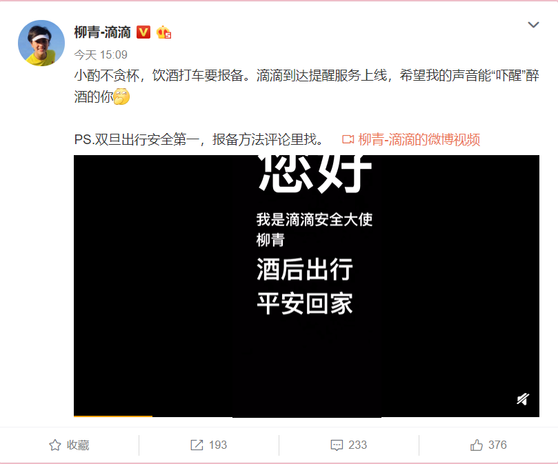 速途网讯 今日,滴滴总裁柳青在其个人微博上透露,自己录制的一段语音将要在平安夜上线。在圣诞、元旦节日期间,只要乘客按提示报备了酒后乘车,在行程结束后,滴滴将向乘客外呼播放柳青录制的到达提醒语音,提示乘客确认是否到达目的地,以及紧急情况下的求助办法。双旦节结束后,外呼语音将恢复为机器人语音。