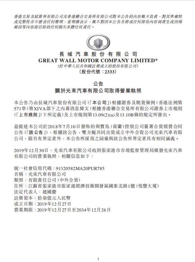 长城汽车:合资公司光束汽车取得营业执照 仙雯 • 2019年12月30日 19:41 • 快讯 速途网讯 昨日,长城汽车在港交所发布公告称,合资公司光束汽车有限公司收到张家港市市场监督管理局颁发的营业执照。光束汽车为此前长城汽车与宝马共同出资成立的中外合资公司。 赞 (0) 仙雯 0 生成海报 GoFun出行与一汽出行举行战略合作签约仪式 上一篇 2019年12月30日 18:48 毕福康:已启动进入中国计划,希望建立合资公司 下一篇 2019年12月30日 20:18