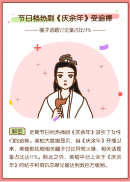 近期节日档热播剧《庆余年》吸引了女性们的追捧。美柚大数据显示,自《庆余年》开播以来,美柚影视剧相关圈子讨论异常火爆,相关话题量占比达11%。除此之外,美柚平台上关于《庆余年》的帖子和资讯总曝光量达到数百万级别。