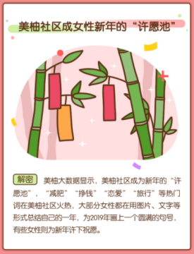 美柚大数据显示,美柚社区成为新年的“许愿池”,“减肥”“挣钱”“恋爱”“旅行”等热门词在美柚社区火热,大部分女性都在用图片、文字等形式总结自己的一年,为2019年画上一个圆满的句号,有些女性则为新年许下祝愿。体现了美柚社区不仅是女性之间沟通交流的渠道,更是女性分享自己新年美好愿望的一种生活方式。