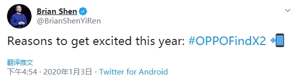 速途网讯 昨日,OPPO副总裁沈义人推特预告OPPO Find X2,表示这款旗舰令人感到兴奋。OPPO Find X2将搭载高通骁龙865旗舰平台,支持SA、NSA双模5G,是Find系列首款5G旗舰。除了超级闪充,关于Find X2的细节暂时不得而知,有一种猜测是OPPO将会在今年首发屏下摄像头,Find X系列有可能会率先商用。