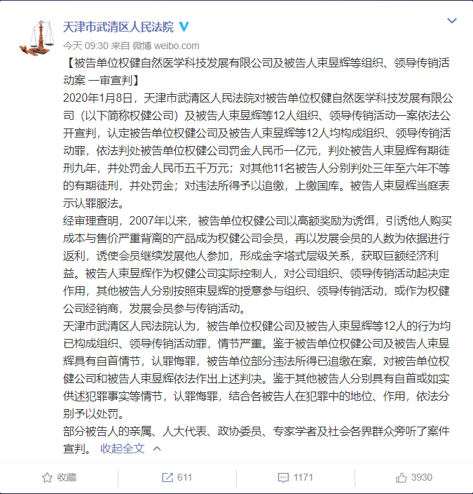 速途网讯 今日,天津市武清区人民法院对被告单位权健自然医学科技发展有限公司及被告人束昱辉等12人组织、领导传销活动一案依法公开宣判,认定被告单位权健公司及被告人束昱辉等12人均构成组织、领导传销活动罪,依法判处被告单位权健公司罚金人民币一亿元,判处被告人束昱辉有期徒刑九年,并处罚金人民币五千万元。